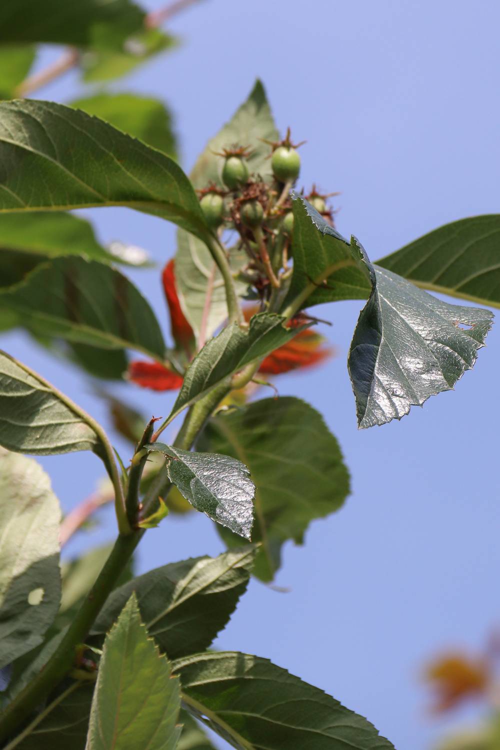 Mai bis Juni; große weiße Doldenrispen, Einzelblüten manchmal rosa, duftend; gelb-rote, apfelähnliche Früchte, bis zum Winter haftend - Licht: