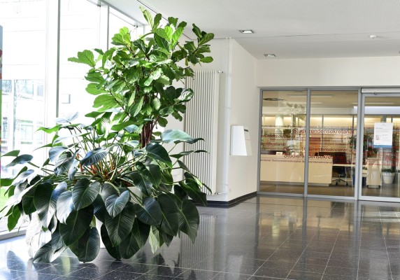 In Gebäuden der Hochschule Osnabrück setzen Pflanzgefäße schöne Akzente. So wurden der Eingangsbereich, die Mensa und das Obergeschoss mit großen Ficus lyratha, kleinen Philodendron congo oder Howea forsteriana bestückt.
